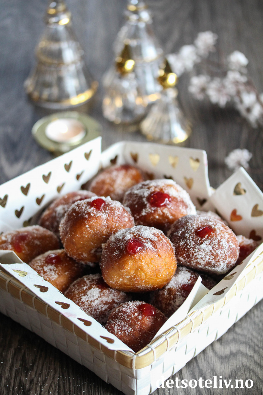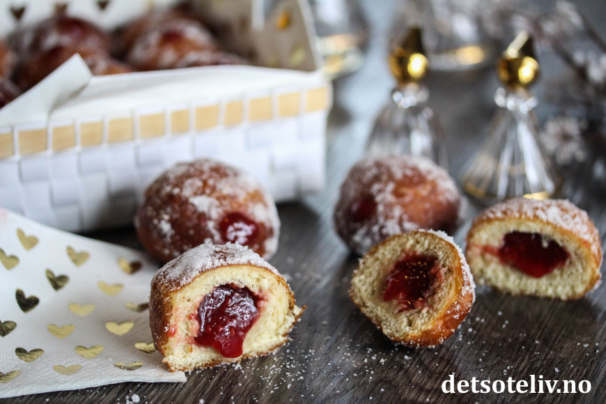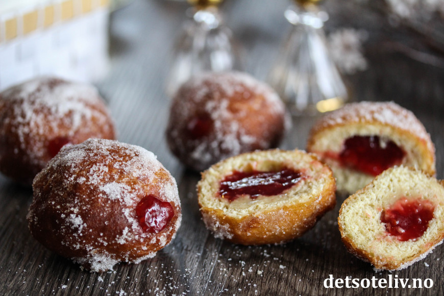 Det røde syltetøyfyllet gjør at bollene passer veldig godt til jul, men Berlinerboller er nydelige å lage hele året.