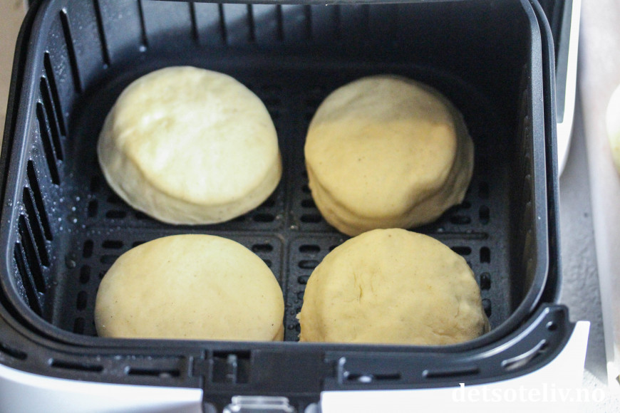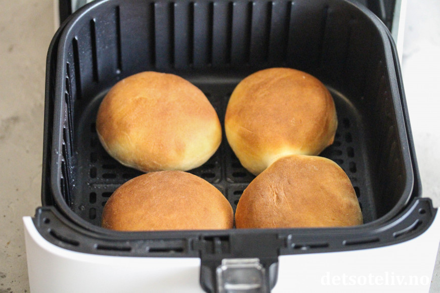 Legg bollene i forvarmet airfryer og stek dem til de er gylne på utsiden og gjennomstekte inni. Det passer å steke 4 om gangen. Husk å spraye underlaget lett med olje slik at de stekte bollene løsner lett.