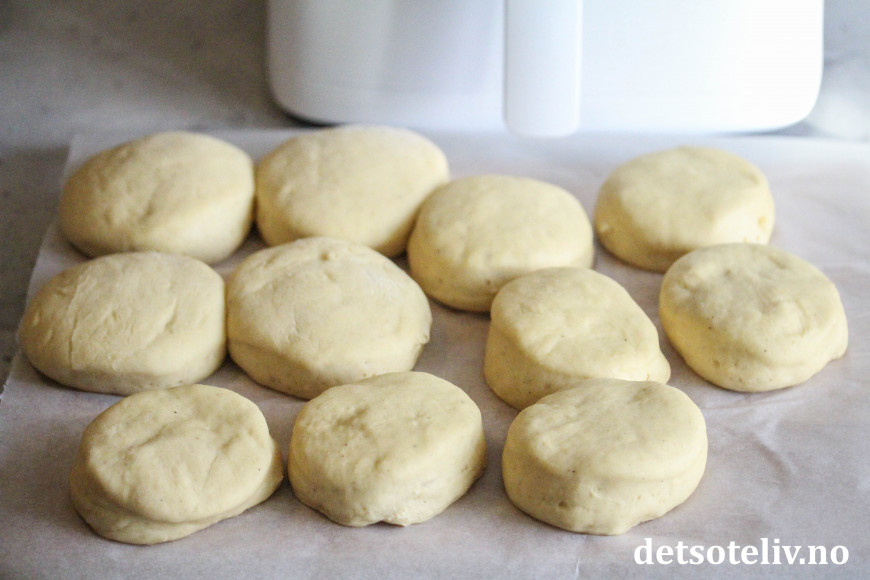 Legg rundingene på et brett som er dekket med bakepapir. La dem etterheve i ca. 30 minutter til de er luftige.