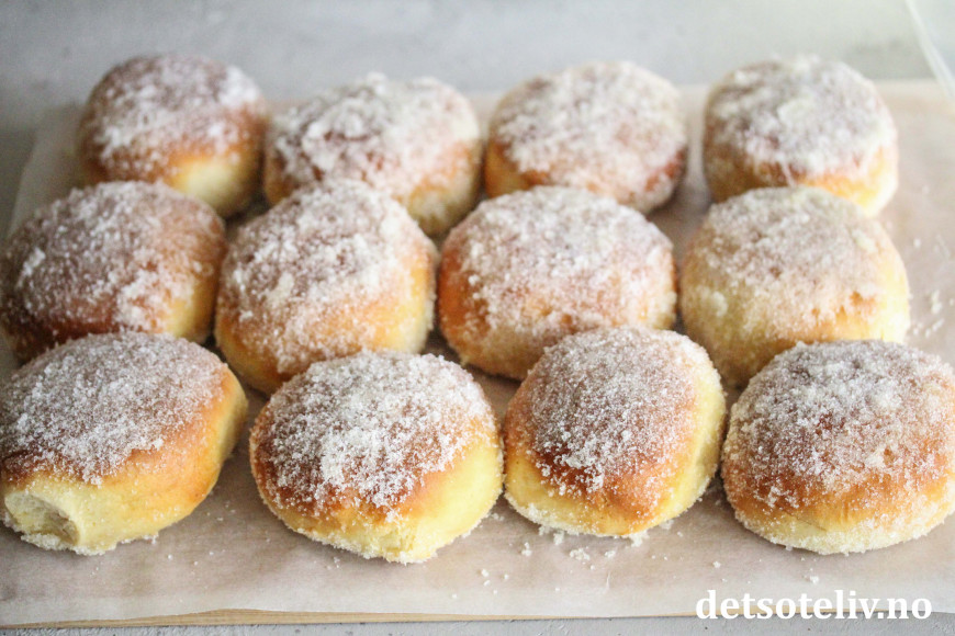 Legg de sukrede bollene på bakepapirdekket brett og la de avkjøles helt.