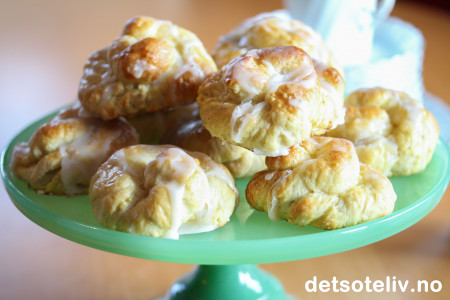 Trykk deigen til et rektangel. Skjær smale remser som er ca. 1,5 cm brede. Tvinn remsene og rull dem sammen til små wienerbrød, med enden på undersiden. Legg wienerbrødene på bakepapirdekkede stekeplater og etterhev dem i 30 minutter.
