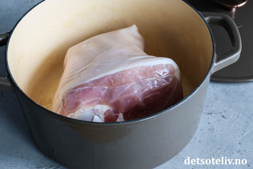 Skyll svineknoken i kaldt vann og ha den i en gryte.