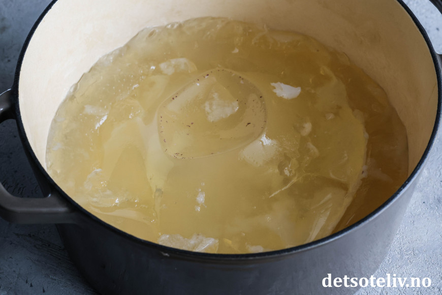 ♥ Kraften vil bli geléaktig når den er kald, som bare er et godt tegn på at den inneholder masse sunn, styrkende gelatin. 😊 Kraften blir flytende igjen ved oppvarming, og eventuelt kan du spe den ut med litt ekstra vann. Jeg fikk ca. 1,8 liter kraft, som jeg spedde ut med vann underveis i kokingen.