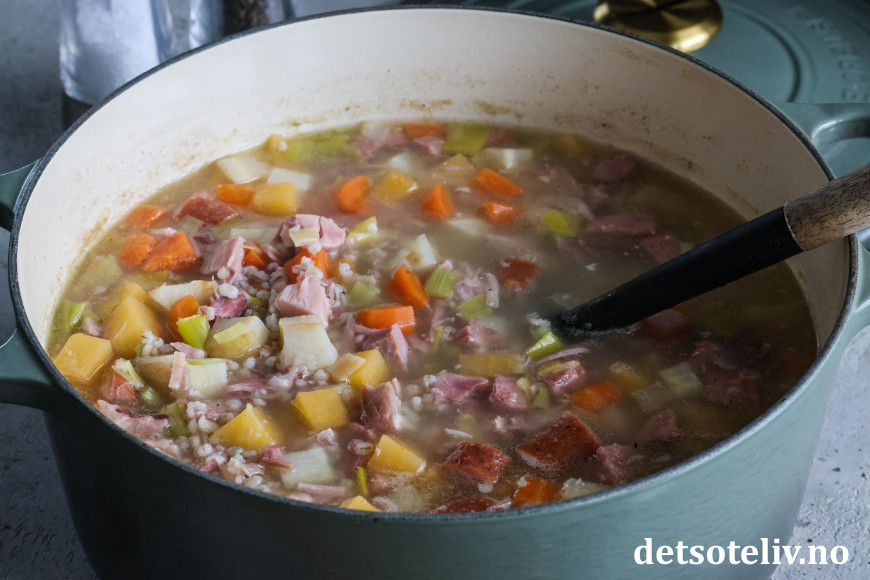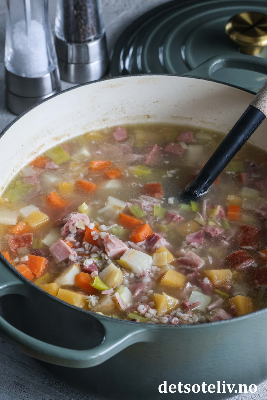♥ Husk at byggryn sveller opp etter hvert som de blir liggende i suppen, så selv om det kan se ut som lite byggryn i starten, blir de mer fremtredende etter hvert.
