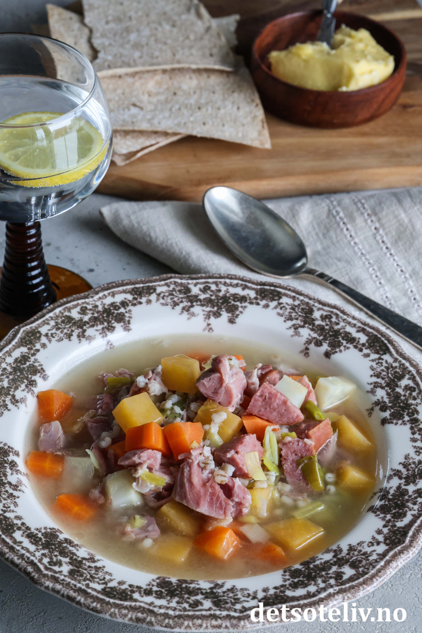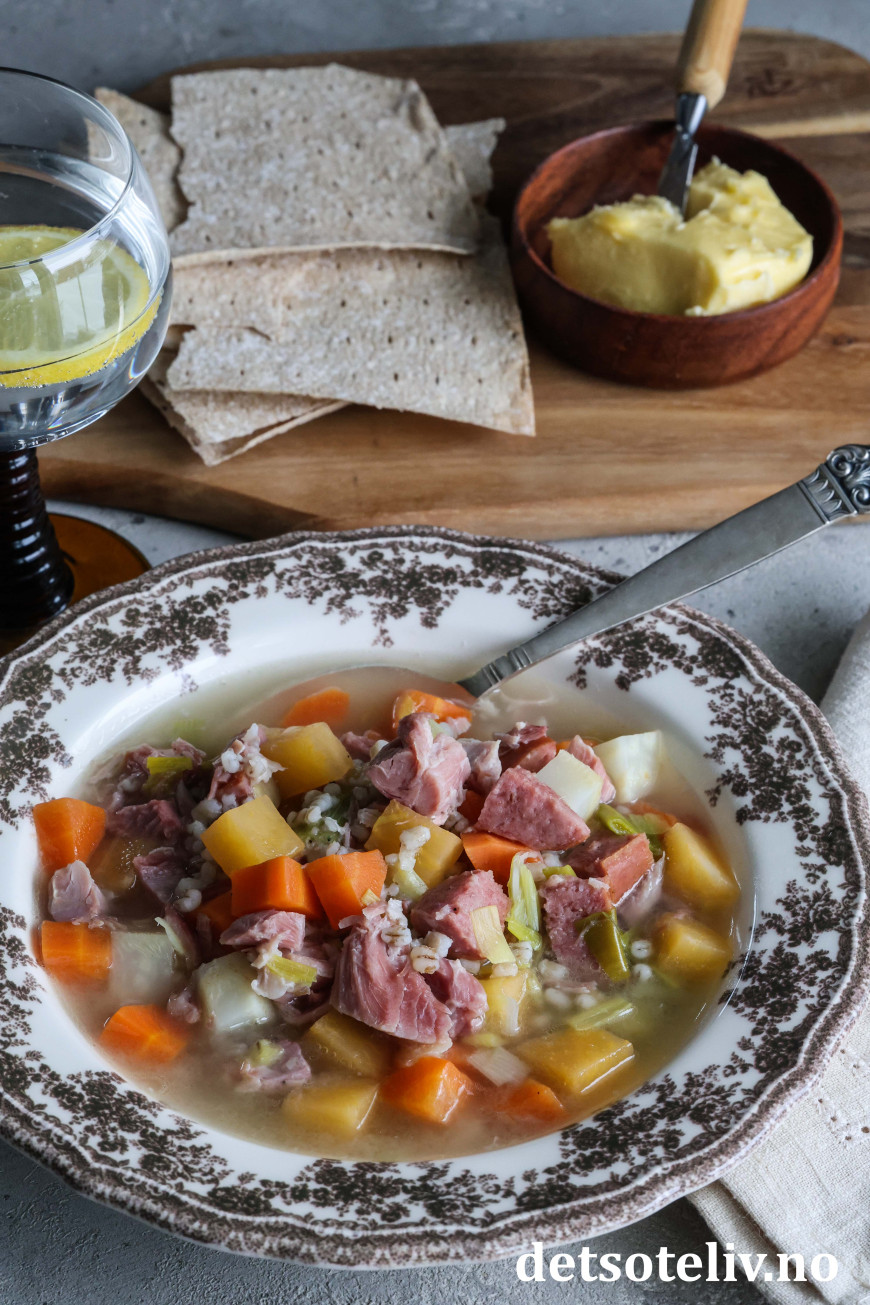 ♥ Som jeg har beskrevet, synes jeg det er veldig greit å bløtlegg byggryn og koke svineknoken dag 1. Da går det raskt å koke suppen ferdig på dag 2.