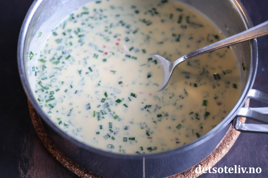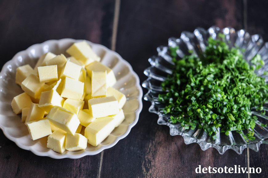Når alt smøret er pisket inn, tilsettes fint hakket gressløk og persille.