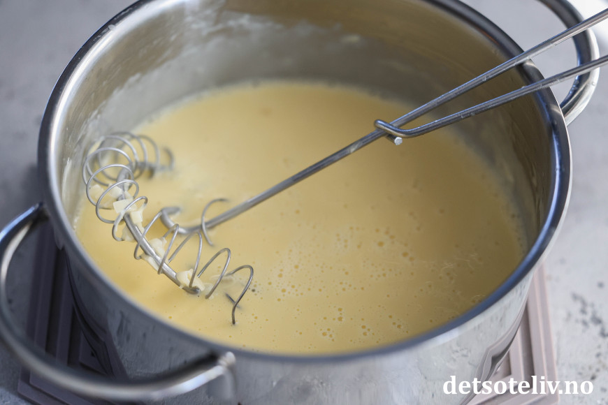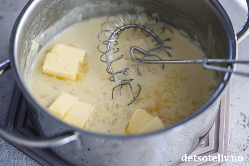 Ta da kjelen av platen. Pisk inn kaldt smør i terninger.