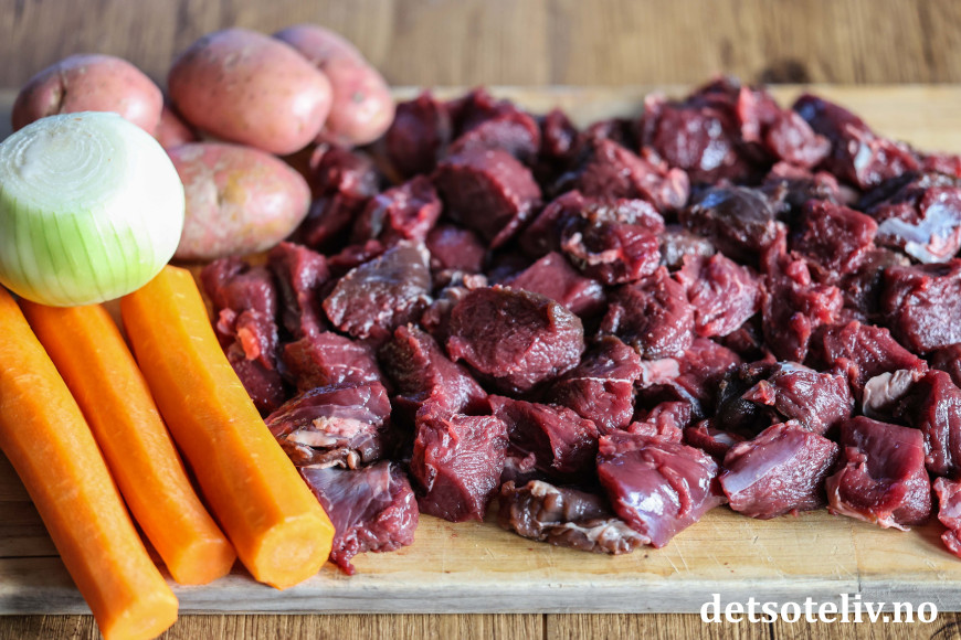 ♥ Bruk helst rent reinsdyrkjøtt. Jeg brukte reinsdyrstek som jeg skjærte i terninger. Dersom du ikke får tak i slike kjøttstykker av reinsdyr, går det også an å bruke reinsdyrskav, som fås kjøpt i de fleste norske matbutikkene.