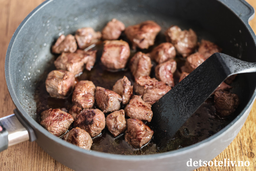Smelt smør i en stekepanne. Brun kjøttbitene i stekepannen slik at de får god stekeskorpe (stek i flere omganger så det ikke blir for fullt i stekepannen).