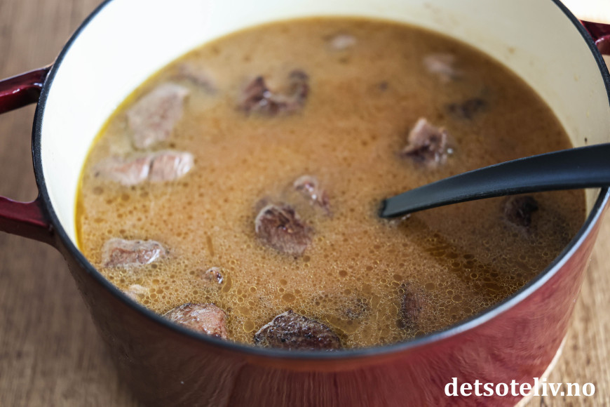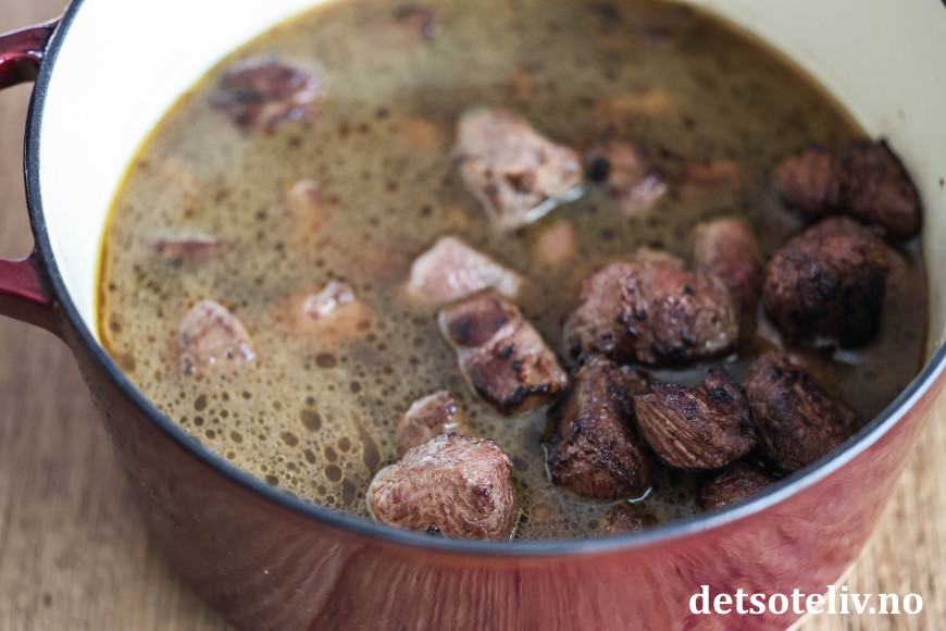 Ha de stekte kjøttbitene i en gryte (husk også å koke ut pannen med litt vann og få med alt fettet og sjyen i pannen).