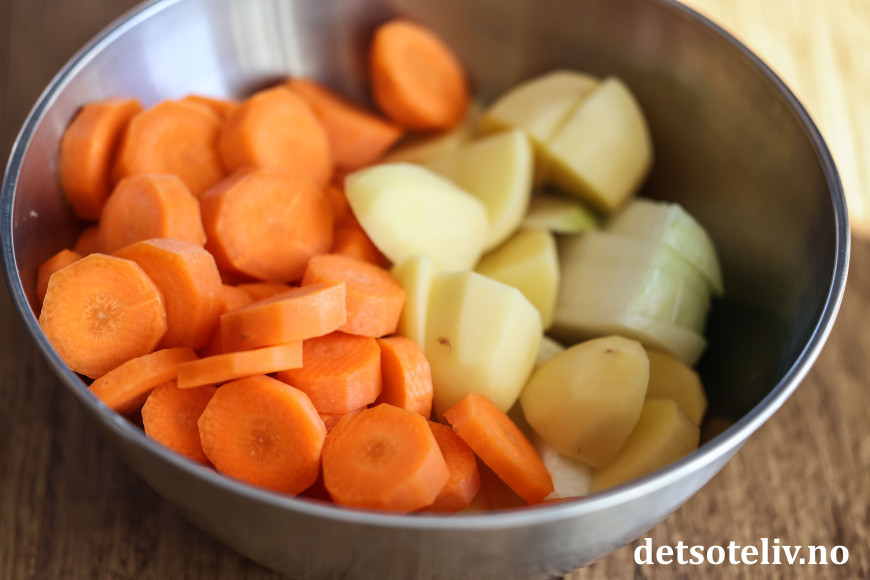Skrell poteter, gulrøtter og løk. Skjær i tykke skiver.