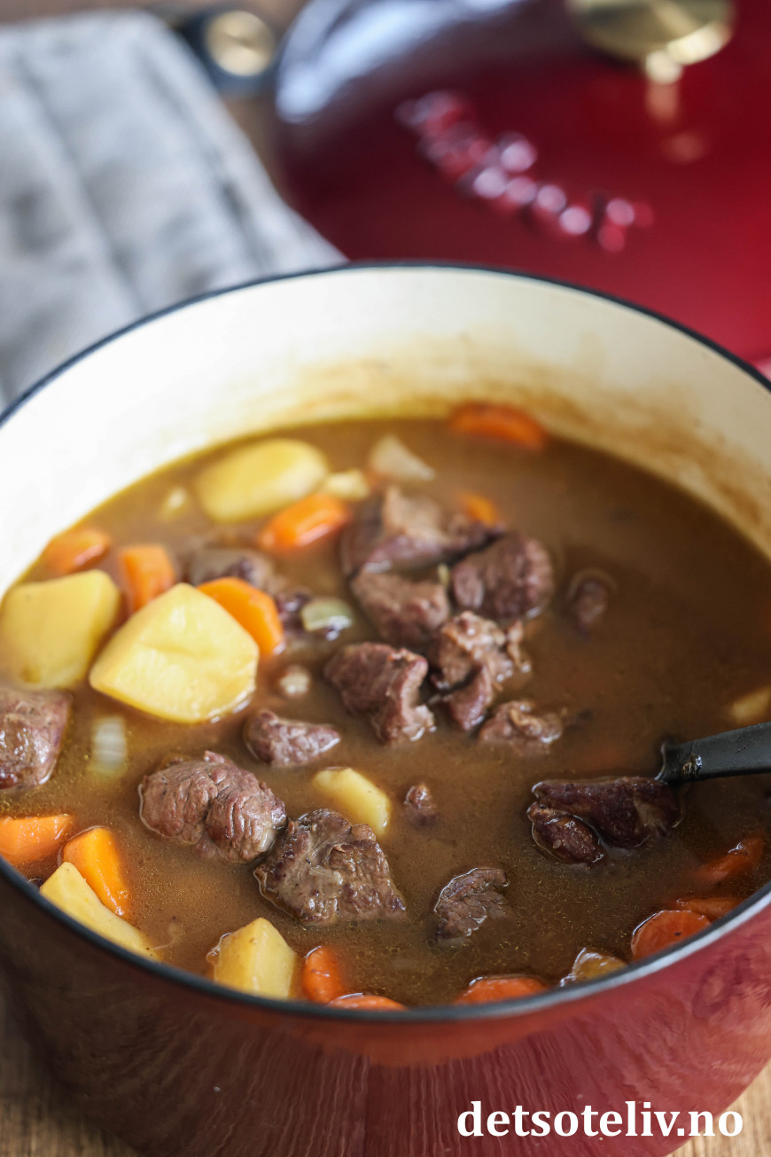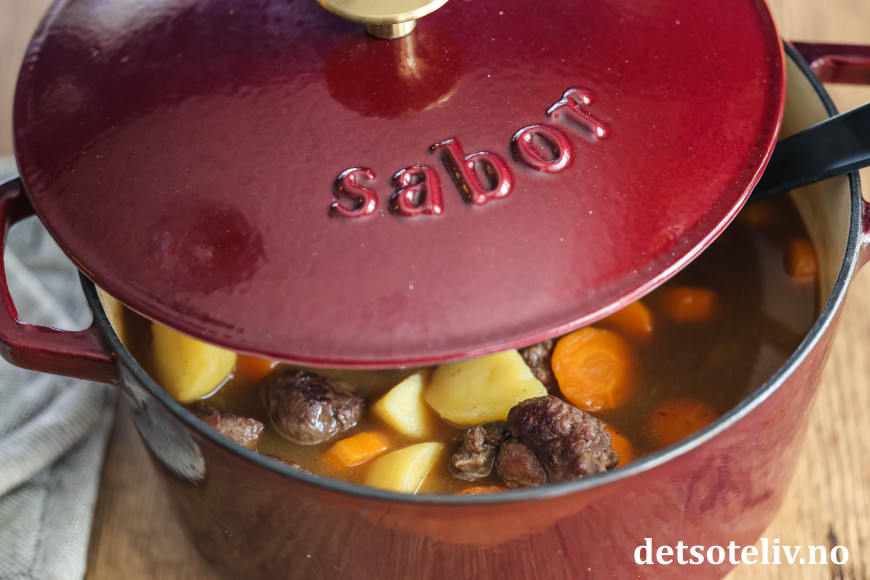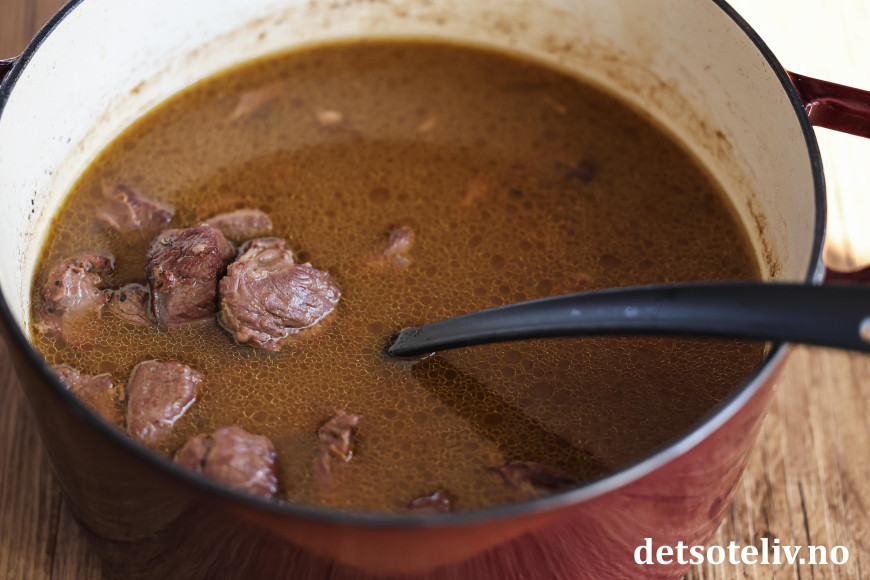 Sett lokk på gryten og gi den et oppkok. Slå ned varmen på ovnen og la kjøttet småputre under lokk i ca. 40 minutter.