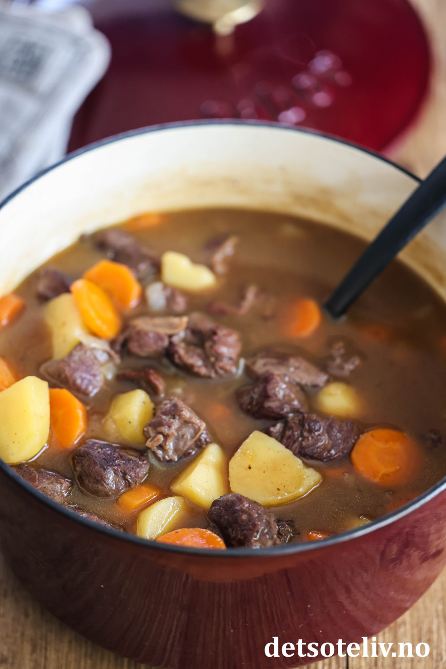 Gi det hele et nytt oppkok og la småkoke under lokk i ca. 15 minutter til, så gulrot-, potet og løkbitene blir møre.