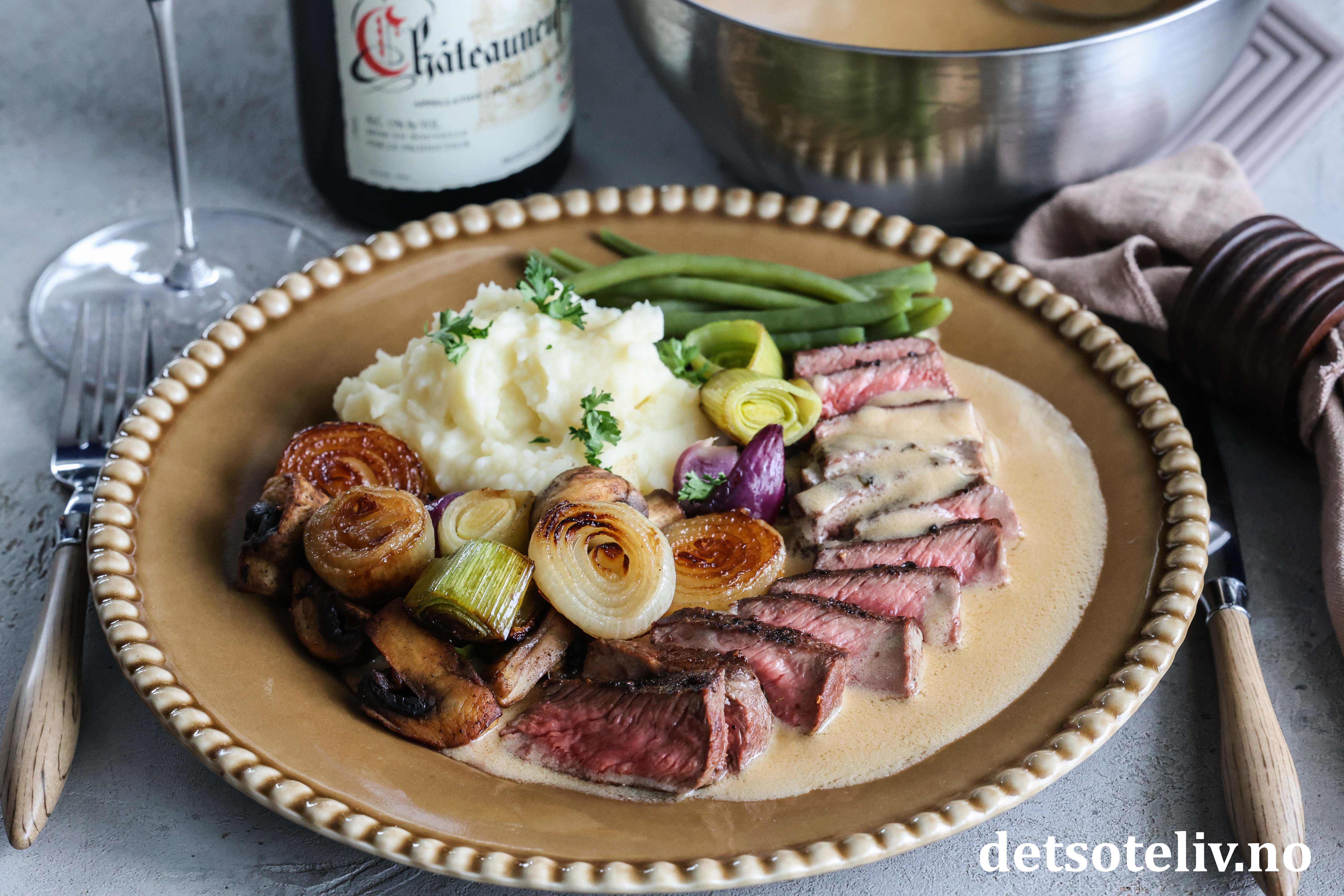 Her serveres stekt ytrefilet sammen med stekt løk (jeg bruker her en kombinasjon av rødløk, purreløk og sjalottløk), smørstekte sopp, aspargesbønner og nydelig, hjemmelaget potetmos. Det er imidlertid den knallgode Konjakksausen som virkelig gjør susen! 😍