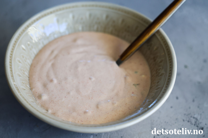 ♥ Hvis du vil lage en lettere variant av denne dressingen, kan du redusere mengden majones og bytte crème fraîche med lettrømme. Smaken blir omtrent den samme, men det vil gjøre at dressingen får en litt tynnere konsistens.