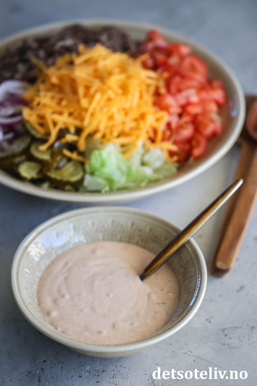 ♥ Jeg har her brukt halv porsjon av Big Mac Dressing (Hamburgerdressing), som jeg synes er passelig til denne salaten, men det er ikke noe i veien for å lage mer dressing hvis du ønsker det.