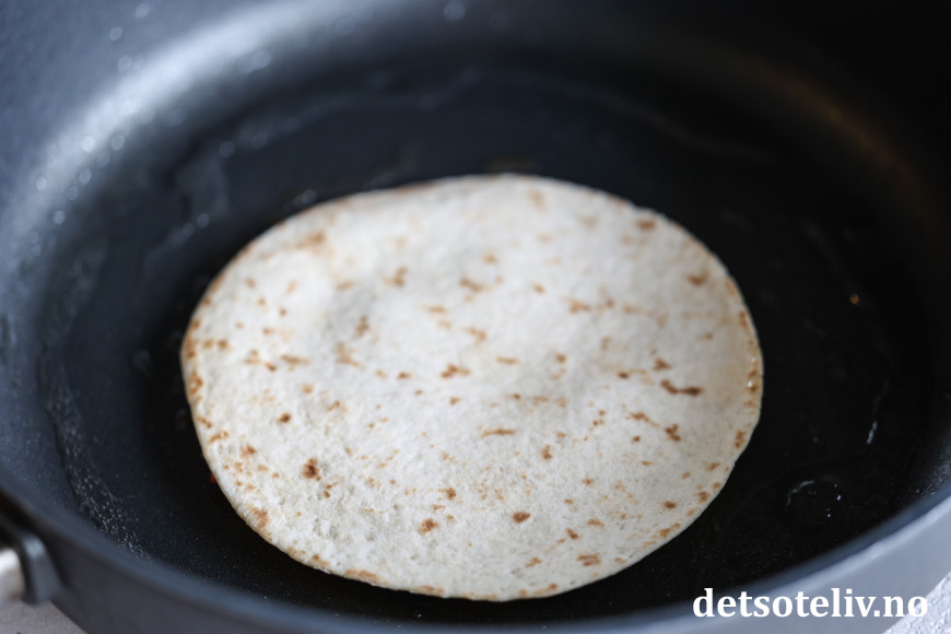 Stek hver tortillalefse i stekepanne med kjøttsiden vendende nedover i 2 - 3 minutter, til kjøttet er gjennomstekt. Ha litt olje i stekepannen mellom hver lefse.