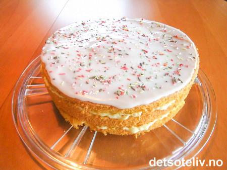 Avkjøl sukkerbrødet helt i formen. Skjær forsiktig langs kanten på formen med en kniv, og ta kaken ut av formen. Fjern bakepapiret og del kaken i 3 bunner.