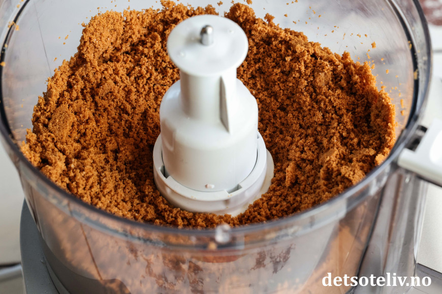 Knus Biscoff-kjeksen til smuler (jeg bruker food processor til dette, men se tips nedenfor hvis du ikke har en food processor).