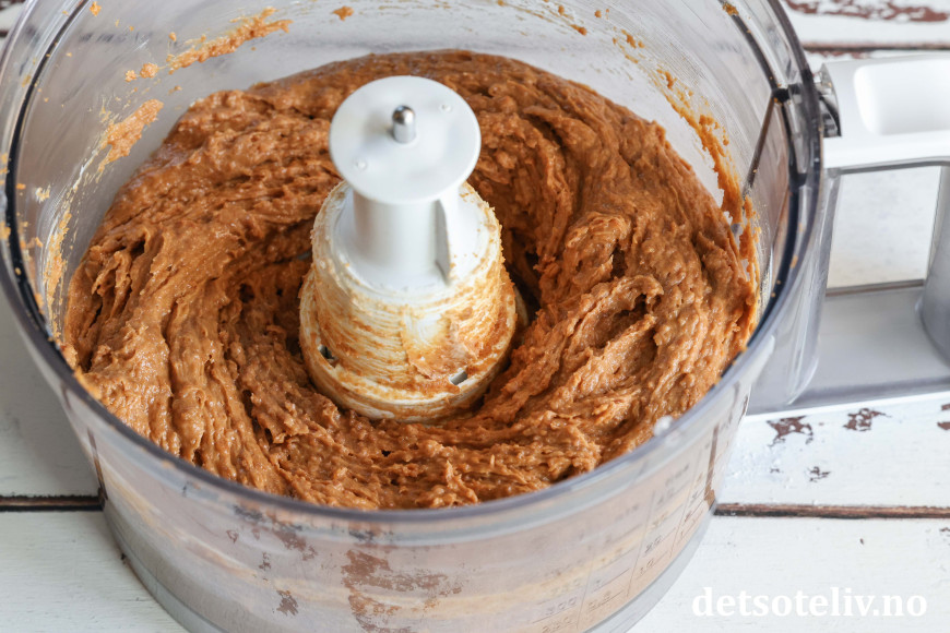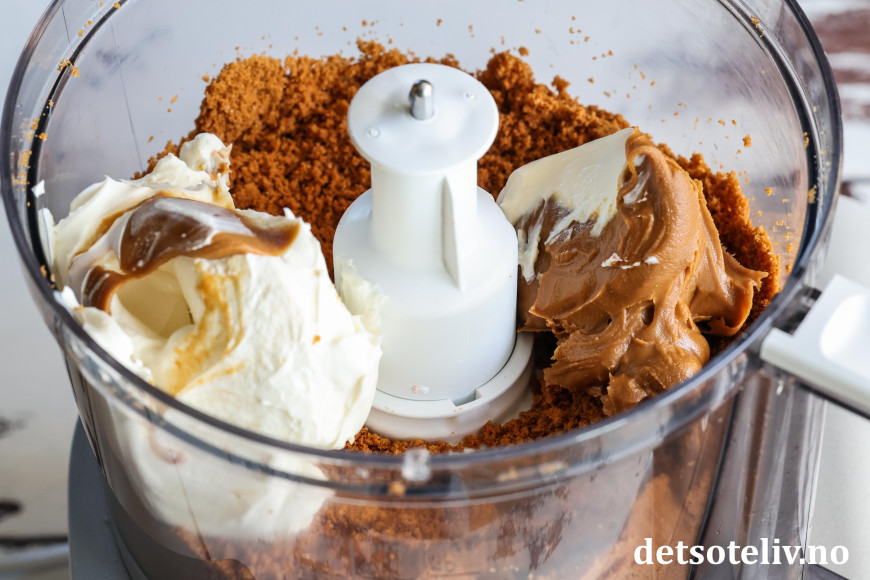 ♥ Hvis du ikke har food processor, går det også fint å knuse kjeksene til smuler ved å ha dem i en pose og kjevle over dem. Ha kjekssmulene deretter i en bolle og kna inn Biscoff-spread, kremost og vanilje med hendene.