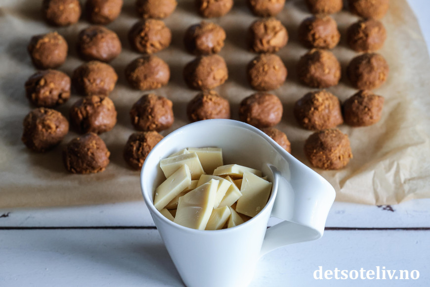 Legg kulene på et brett dekket med bakepapir. Sett brettet kjølig til kulene blir fastere. Dette kan enten være noen timer (eller over natten) i kjøleskapet eller, hvis du har dårligere tid, ca. en halvtime i fryseren.