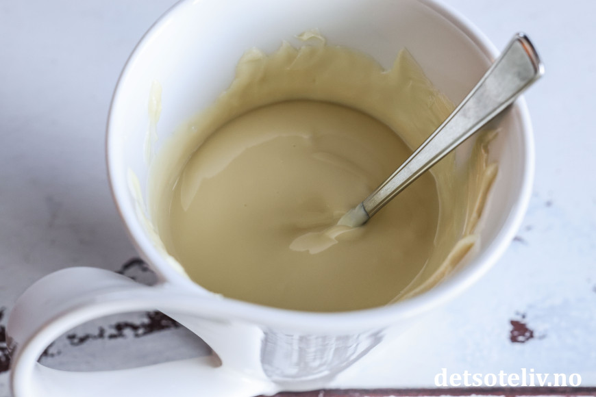 Smelt hvit sjokolade (jeg gjør dette i en kopp som jeg setter i mikrobølgeovnen, se tips).