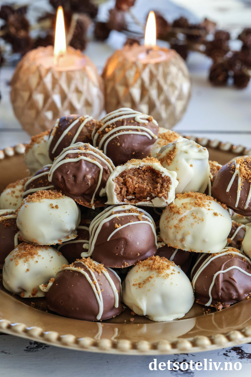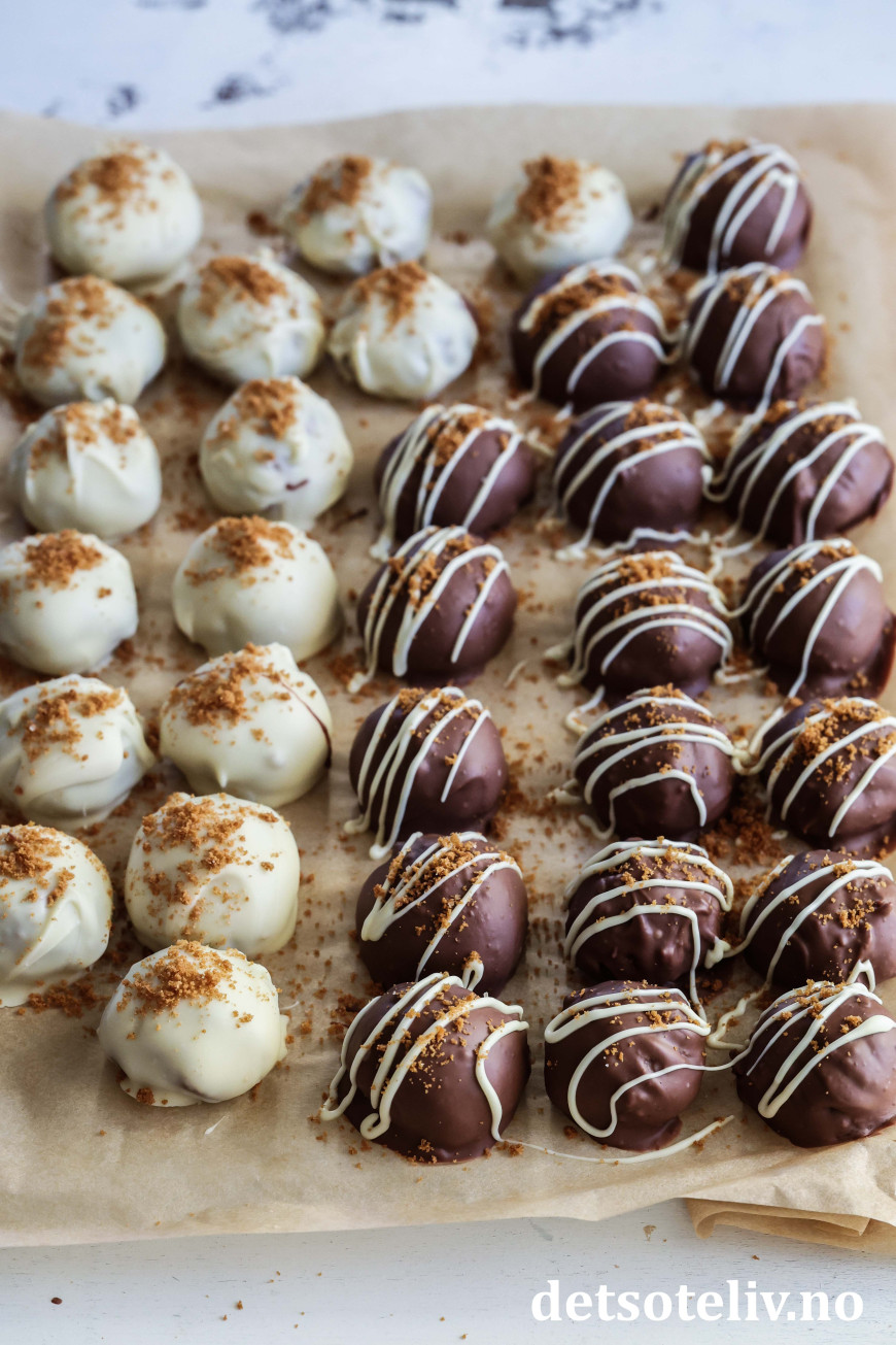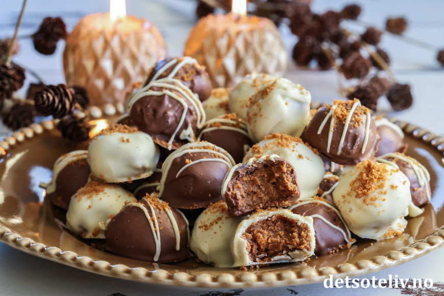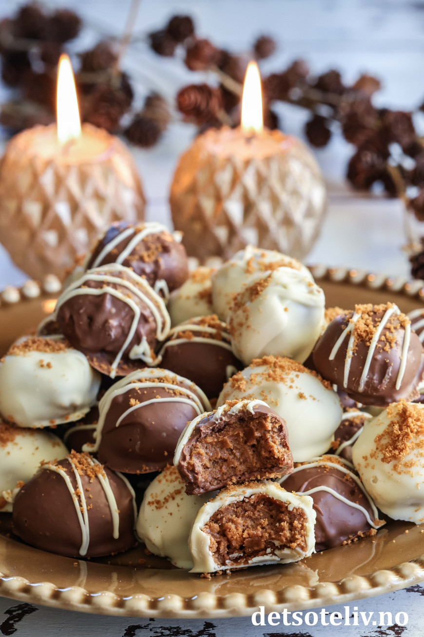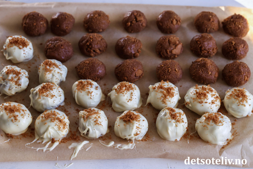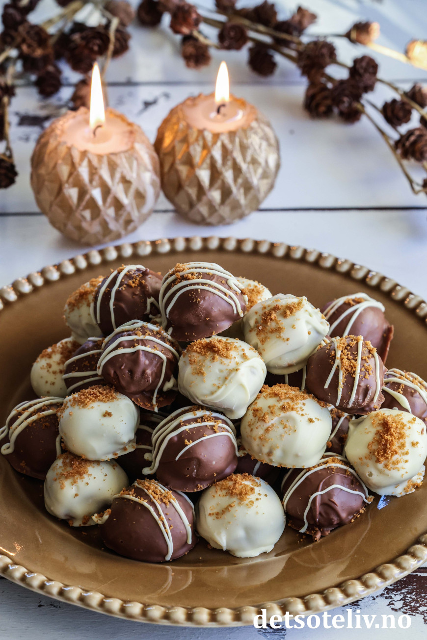 Sett brettet med de sjokoladedyppede Biscoff-kulene i kjøleskapet i ca. 1 time, til sjokoladen har stivnet helt.