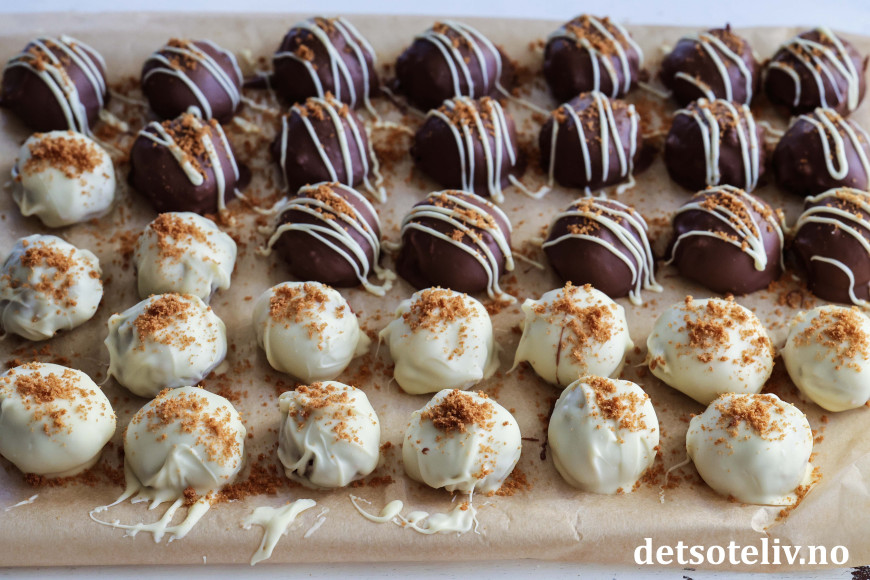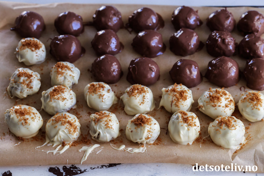 Smelt melkesjokoladen og dypp resten av kulene i denne. Sett brettet i kjøleskapet til melkesjokoladetrekket har stivnet. Pynt de mørke kulene deretter med noen striper smeltet hvit sjokolade og et lite dryss kjekssmuler.