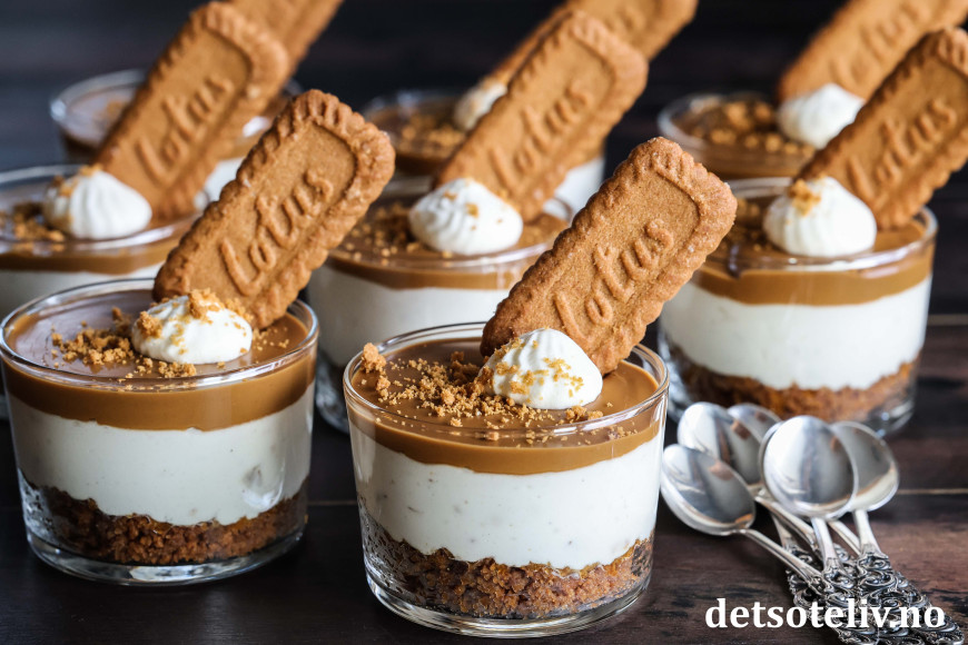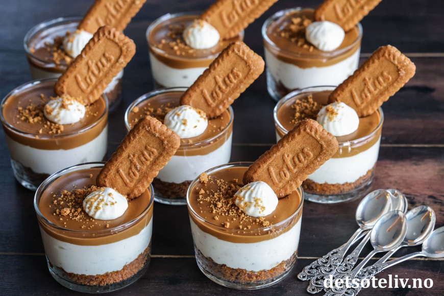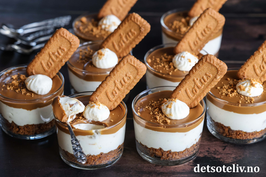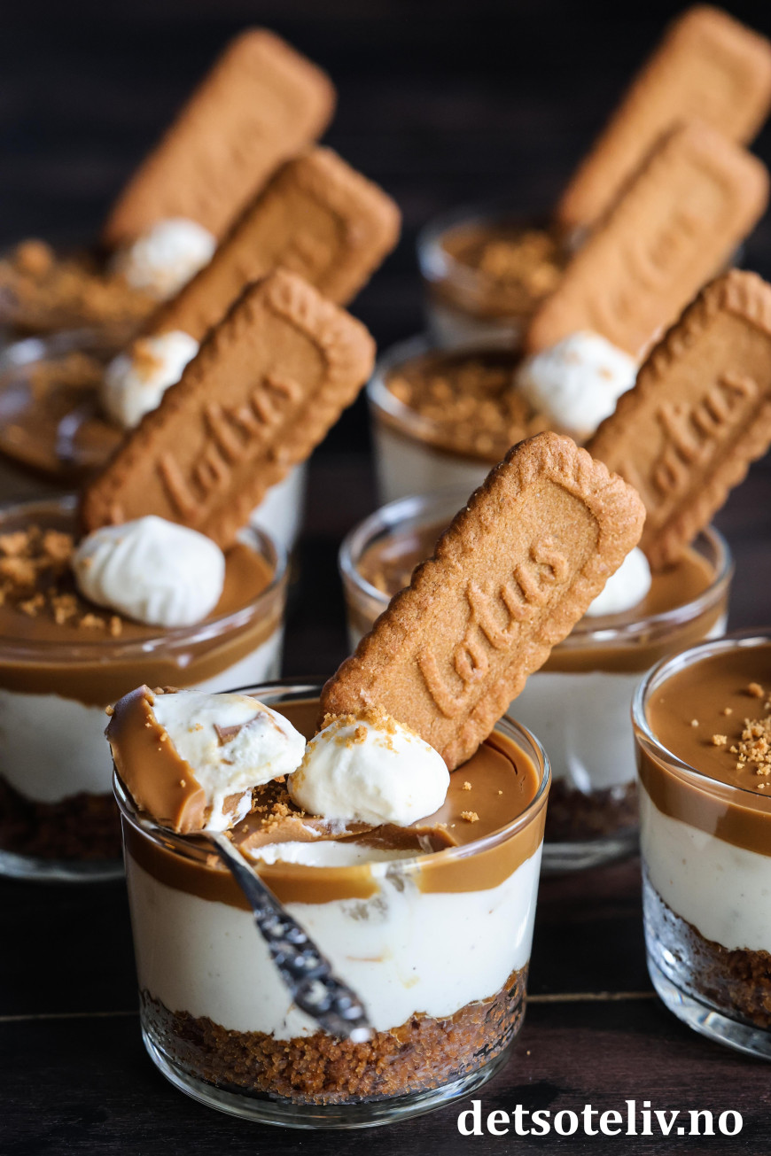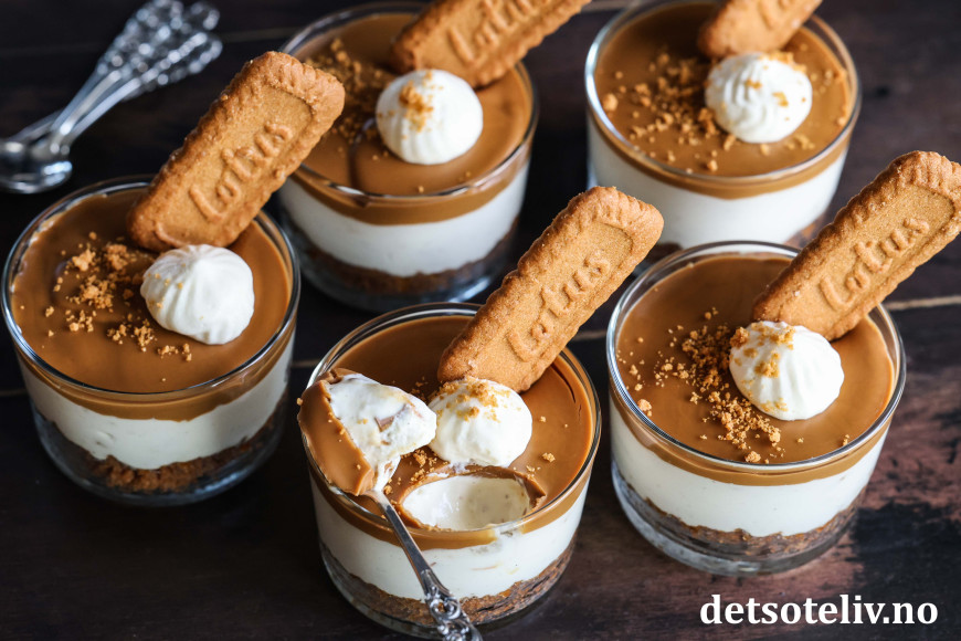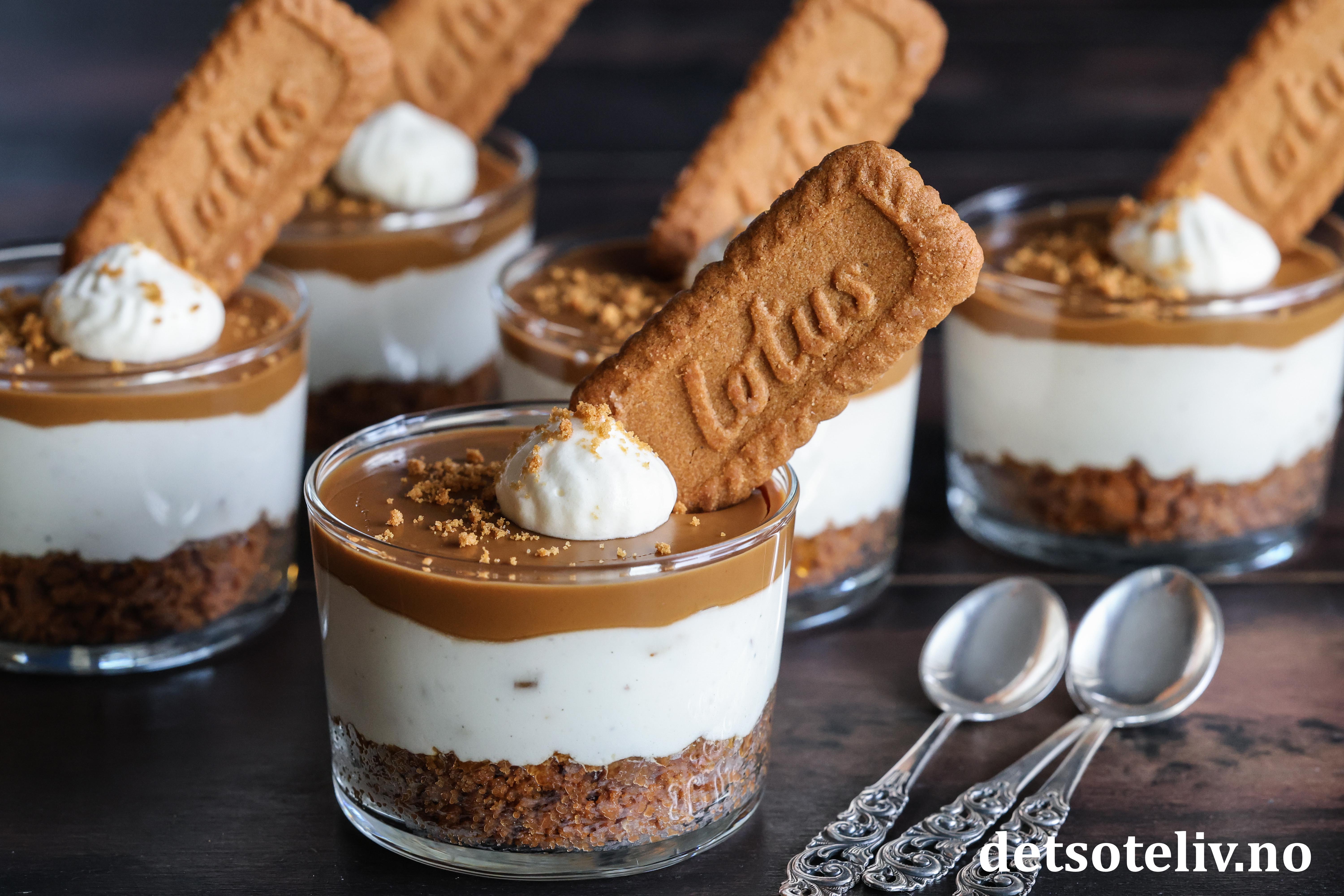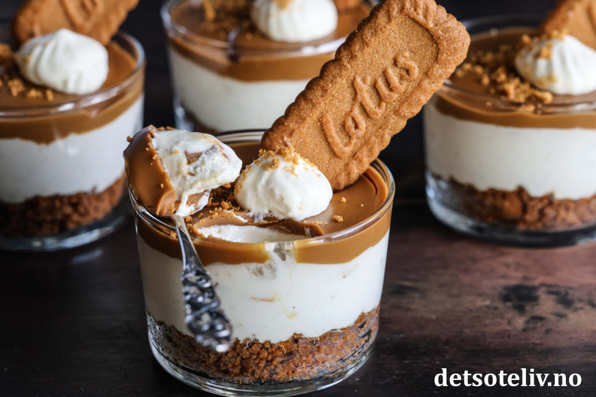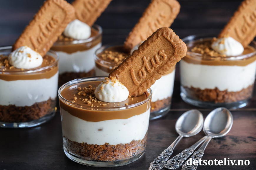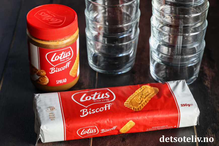 ♥ En pakke Lotus Biscoff kjeks inneholder 250 g, så du trenger 2 pakker til denne desserten hvis du vil pynte hvert dessertglass med hele kjeks. Hvis ikke, klarer du deg med 1 pakke, bare spar et par kjeks til å lage smuler som du bruker til pynt. Jeg har funnet både kjeksene og pålegget hos Meny og Coop Mega.
