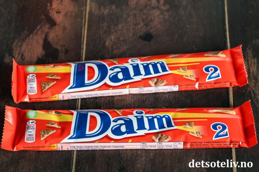 ♥ Jeg brukte 1 dobbel Daim til ostefyllet (56 gram) (selv om det er to doble Daim på bildet 😊).