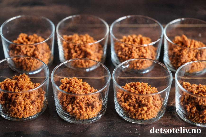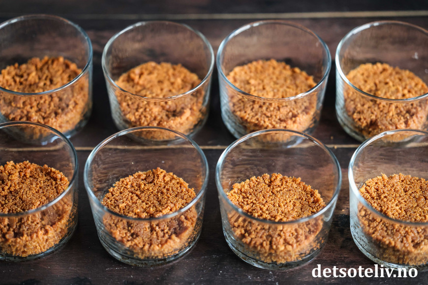 Fordel kjeksen i 8 dessertglass. Trykk lett på kjekssmulene slik at de legger seg jevnt i bunnen av glasset.