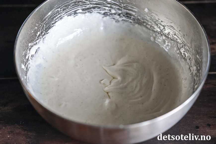 Pisk sammen kremost, melis og vaniljesukker i en bolle (bruk helst ekte vaniljesukker).