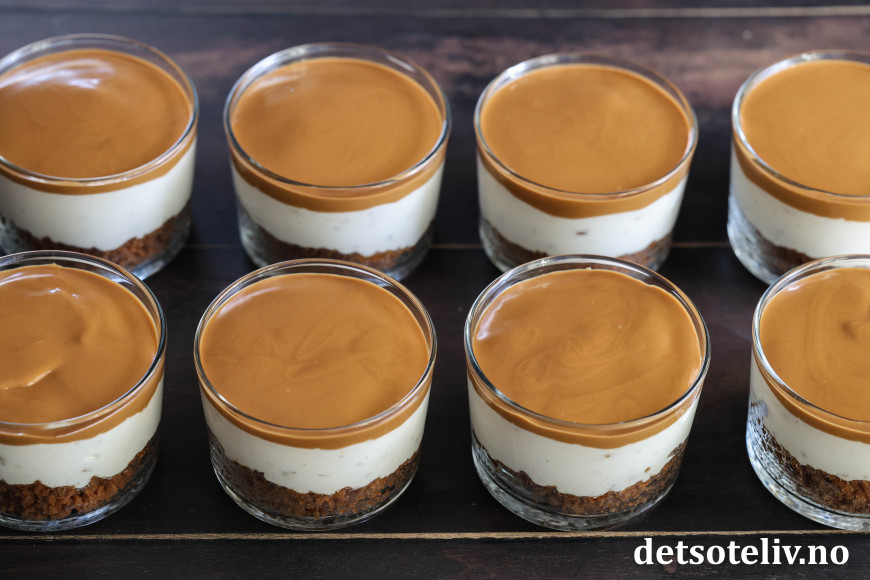 Sett glassene i kjøleskapet i minst 2 timer, slik at ostekremen blir fastere i konsistensen.