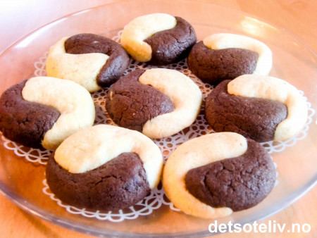 Trill små kuler av lys og mørk deig som så formes til lengder med tykk rund ende på den ene siden og tynn ende på den andre siden. Legg disse mot hverandre og fold den tynne enden over den tykke enden på hver side så du får runde kaker. Avkjøl kakene i kjøleskapet i 1-2 timer (se tips).