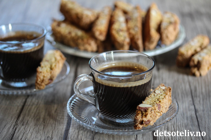 Hvis du vil nyte Biscotti som en ekte italiener, bør du dyppe dem i sterk kaffe, søt sherry eller aller helst den kjempenydelige italienske dessertvinen Vin Santo (som betyr "hellig vin")
