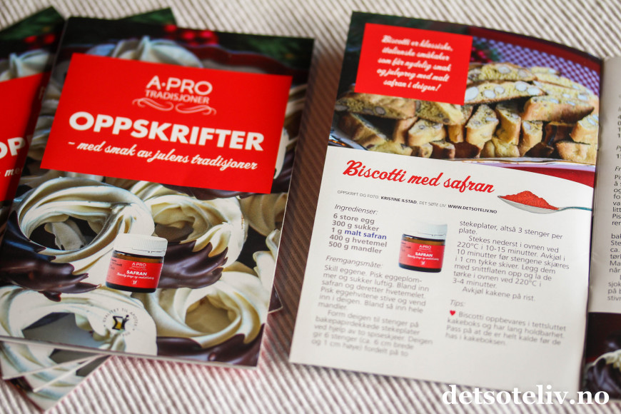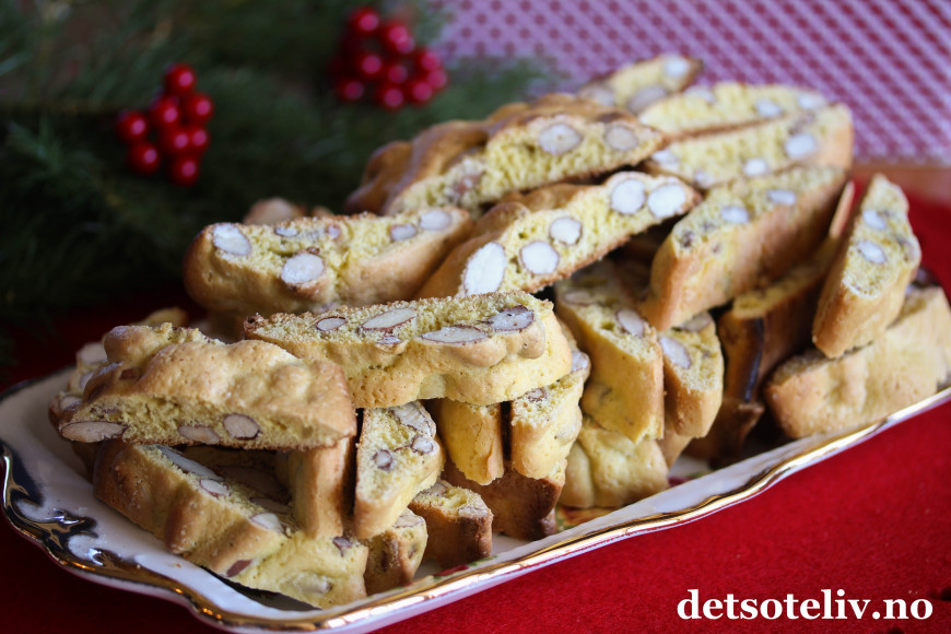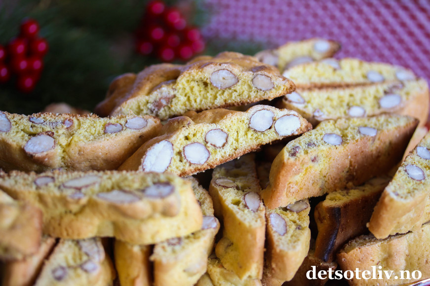 En julekake som går utmerket å lage allerede nå er Biscotti med safran. Biscotti er klassiske, italienske småkaker som har meget lang holdbarhet. De kan lages i mange varianter (du finner allerede flere typer her på Det søte liv), og denne gangen har jeg altså tilsatt safran i tillegg til mandlene, som både gir fin farge, nydelig smak og fint julepreg på kakene.