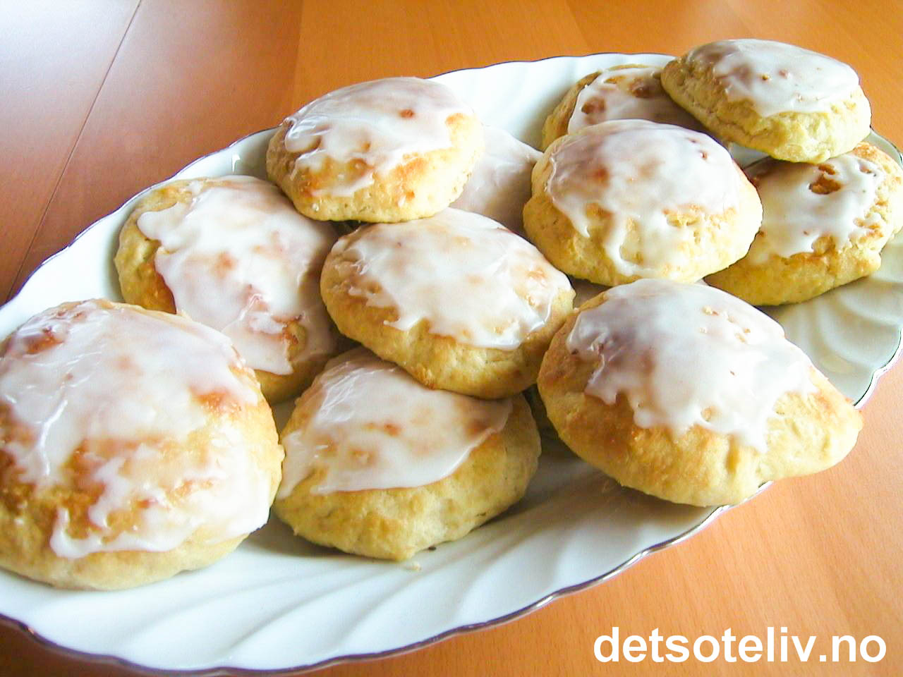 Stek bollene midt i ovnen ved 250°C i 5-8 min. Avkjøl bollene litt på platen før de flyttes over på rist og avkjøles helt. Glaser de kalde bollene med melisglasur som eventuelt er smaksatt med litt romessens.