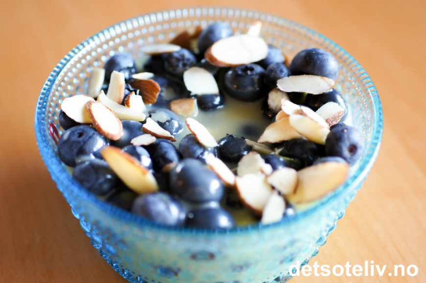 Hell hvit sjokoladesaus over blåbærene. Pynt med et dryss mandelflarn!