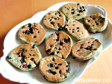 Stek små lapper (ca 1 ss deig pr stk) i teflonpanne. Spray pannen eventuelt med litt formfett. Dryss blåbær umiddelbart på lappene, slik at de fester seg i deigen mens lappene steker. Lappene stekes ca 1-2 min på hver side på middels varme.
