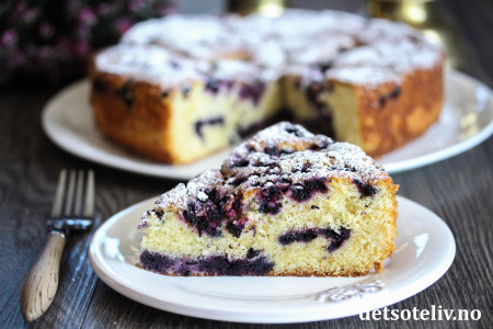 Kaken blir finest hvis du bruker friske skogsblåbær, men du kan til nød også bruke frosne bær. Merk at frosne bær ikke skal tines før du har dem på kaken. Beregn litt lenger steketid hvis du bruker frosne bær (sjekk med kakenål).