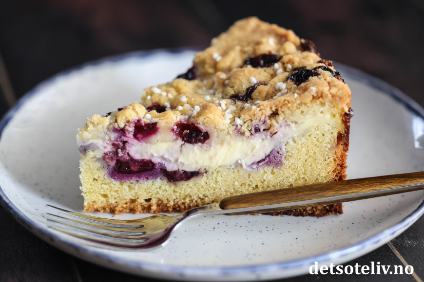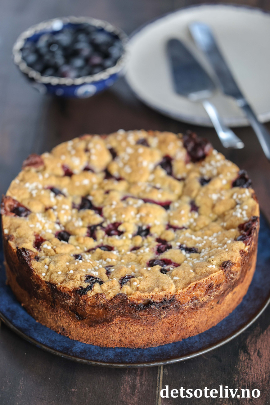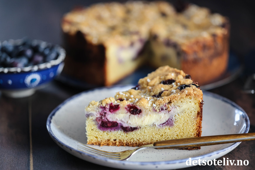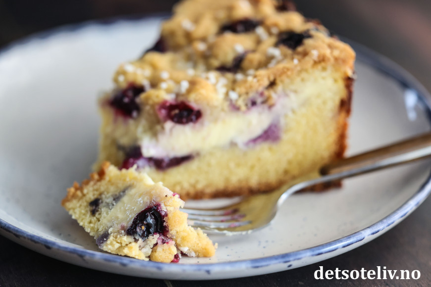 Kaken består av en myk kakebunn som dekkes med masse blåbær, vaniljekrem og smuldredeig.