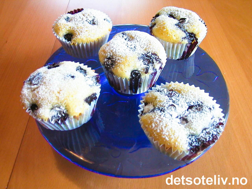 Stek muffinsene på rist midt i ovnen ved 180°C i 20-25 min. Avkjøl muffinsene litt i formen. Løsne dem forsiktig fra kanten av formen med en skarp kniv. Hvelv muffinsene deretter forsiktig ut av muffinsbrettet. Pynt med å sikte over litt melis før servering.