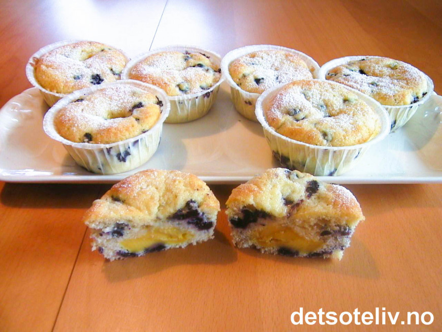 Visp smør og sukker til luftig smørkrem. Pisk inn ett egg om gangen. Bland rensede, friske blåbær eller frosne (ikke tinte!) blåbær med 0,5 dl av hvetemelet. Bland resten av melet med bakepulveret og ha i deigen vekselsvis med melk. Rør til slutt forsiktig i blåbærene. Fordel deigen i store muffinsformer.