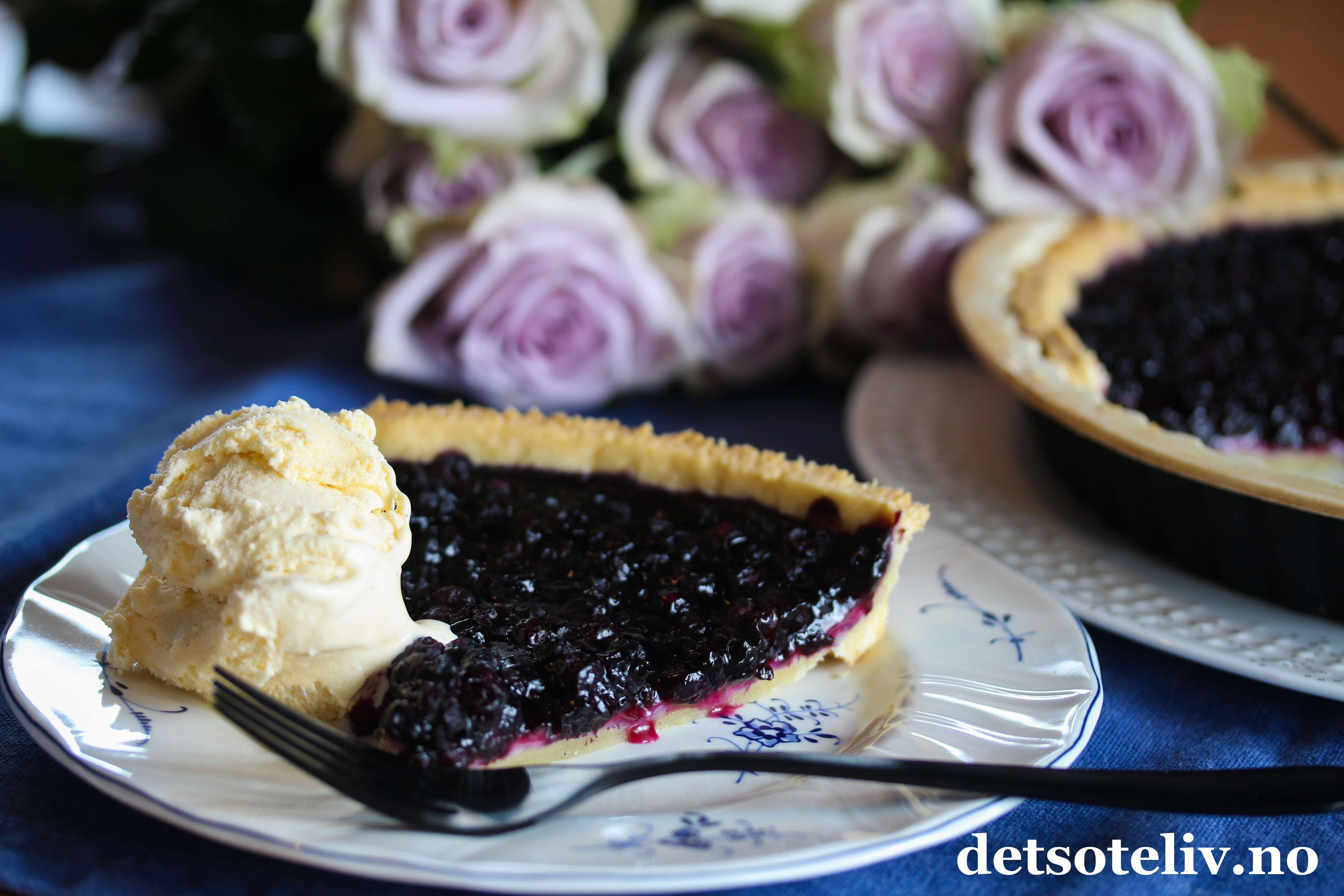Blåbærpaien smaker nydelig sammen med vaniljesaus, krem og/eller vaniljeis.
