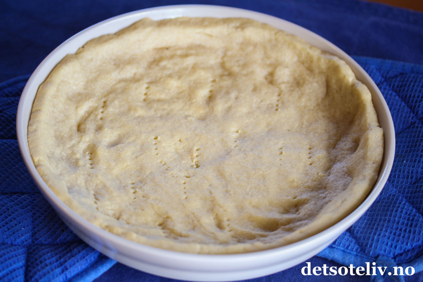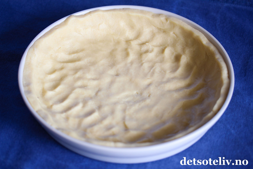 Smør en ildfast form/paiform (24 cm i diameter). Klem deigen utover bunn og kanter på formen.