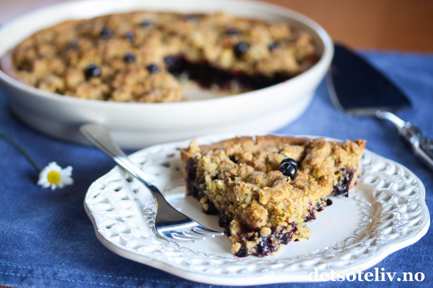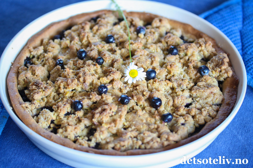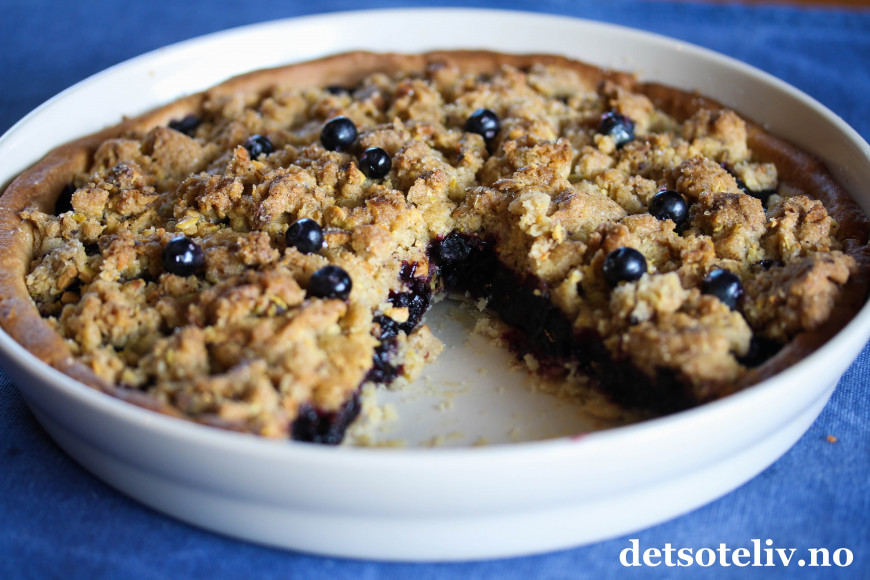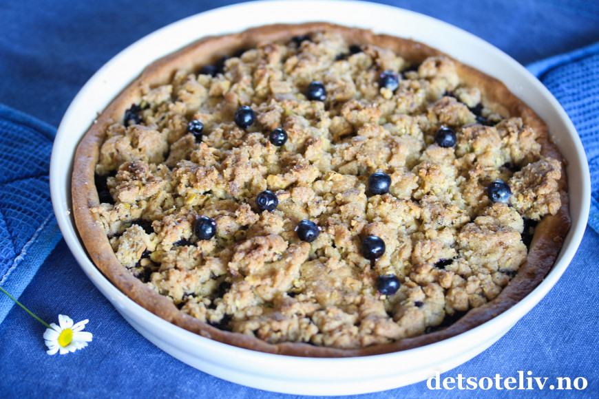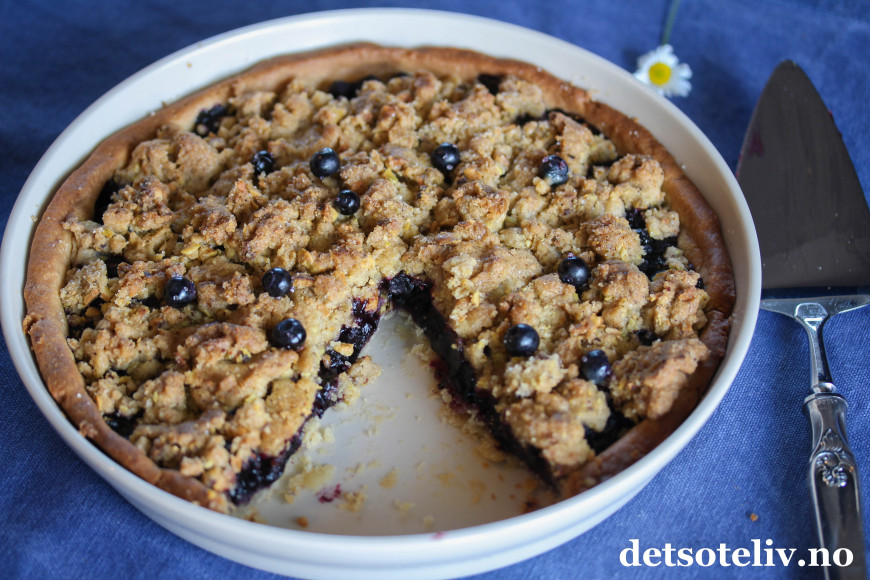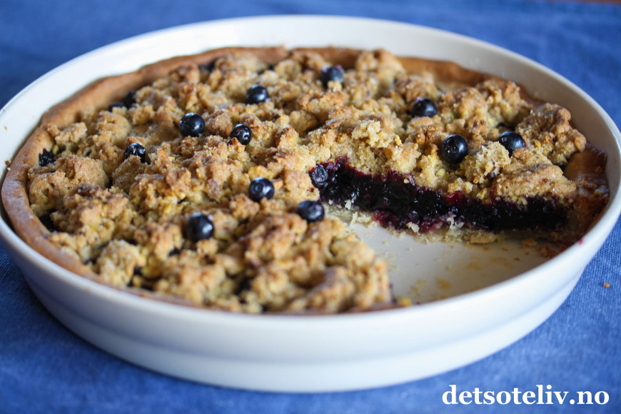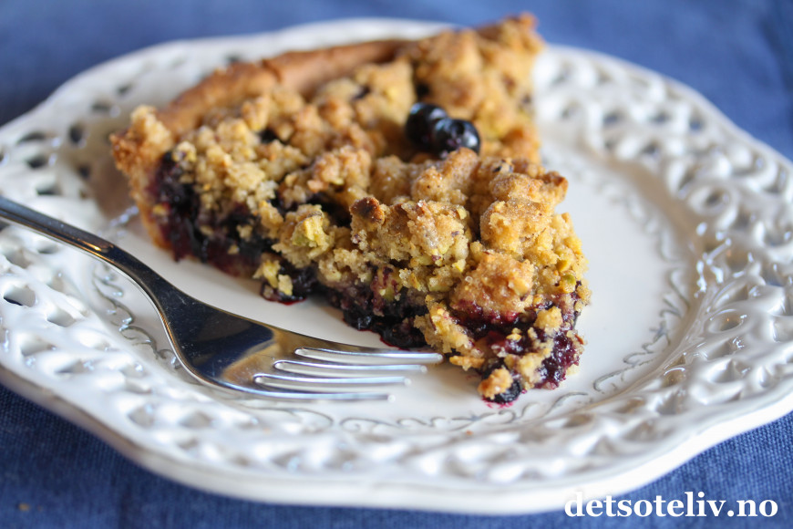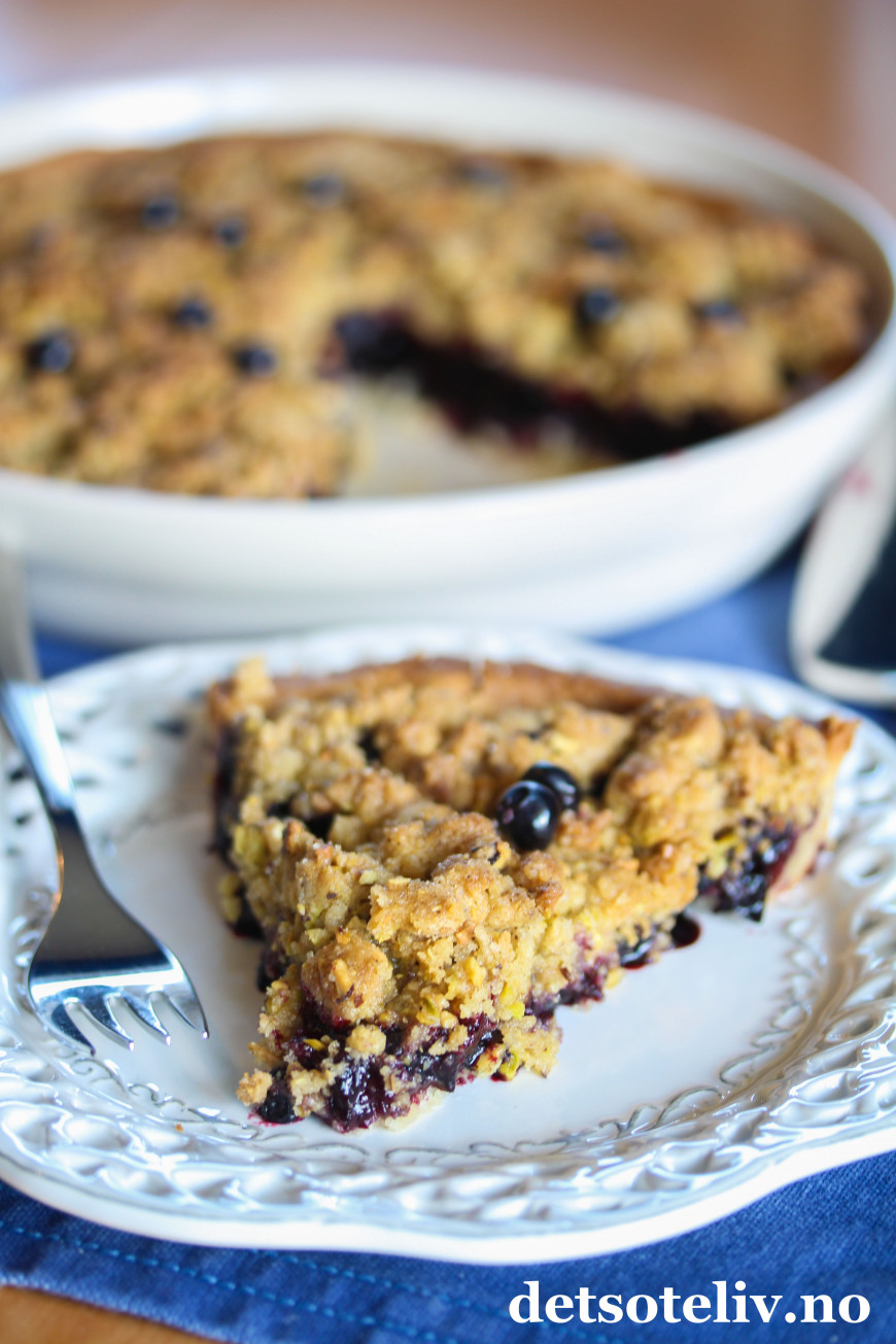 Her har du en kjempegod blåbærpai med smuldretopping som smaker deilig av kanel og pistasjnøtter (andre nøtter kan også brukes).