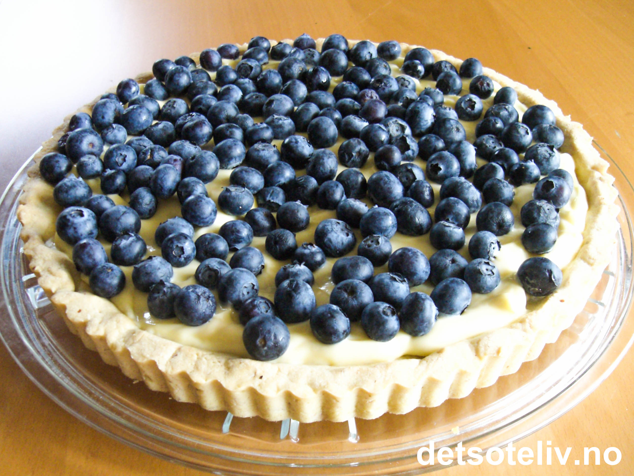 Sett den kalde paibunnen på et passende kakefat. Smør vaniljekremen utover bunnen og legg på friske blåbær.