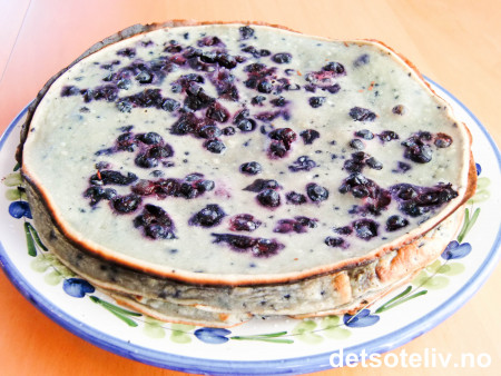 Pisk sammen alle ingredienser til pannekakerøren. La stå og svelle i 20 min. Vend forsiktig i blåbærene.