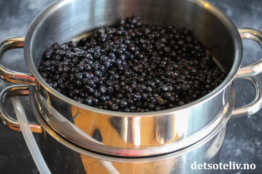 Sett på lokket og la bærene dampe. Du vil etterhvert se at det samler seg opp saft i den midterste delen av kjelen. Jeg lar dampingen foregå i ca. 1 time, men hold på til du ser at all saften fra bærene er borte.