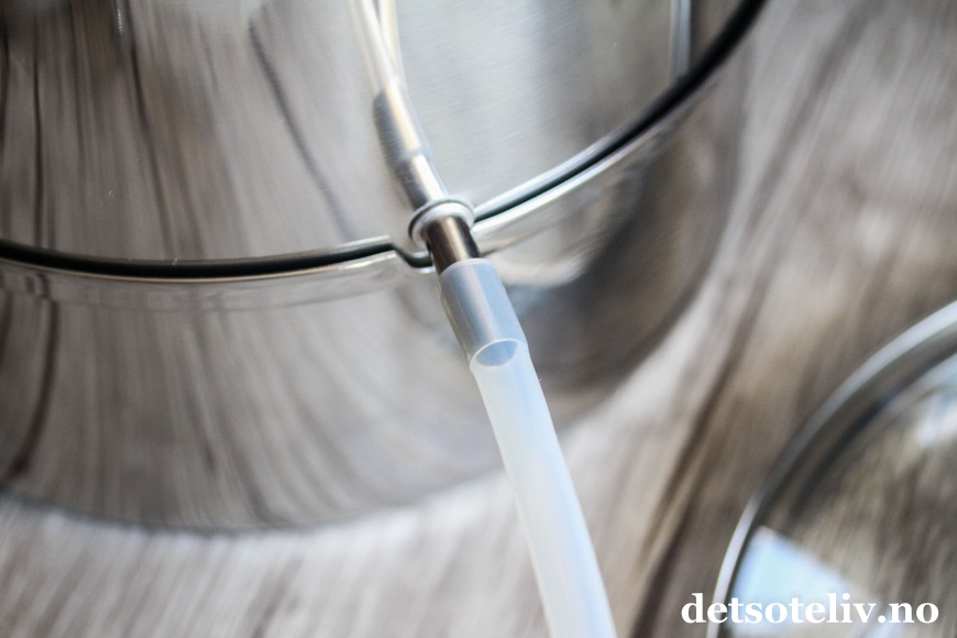 2. I den midterste delen av kjelen samles råsaften. Du vil se at det er en stor åpning nederst som gjør at dampen slipper oppover i kjelen. Åpningen er høyt plassert slik at råsaften ikke skal renne ned i kjelen med vann under. Til den midterste delen av kjelen er det koblet en gummislange hvor saften tappes ut fra. Det følger med med en kraftig slangeklype slik at man har full kontroll på når det renner ut saft.